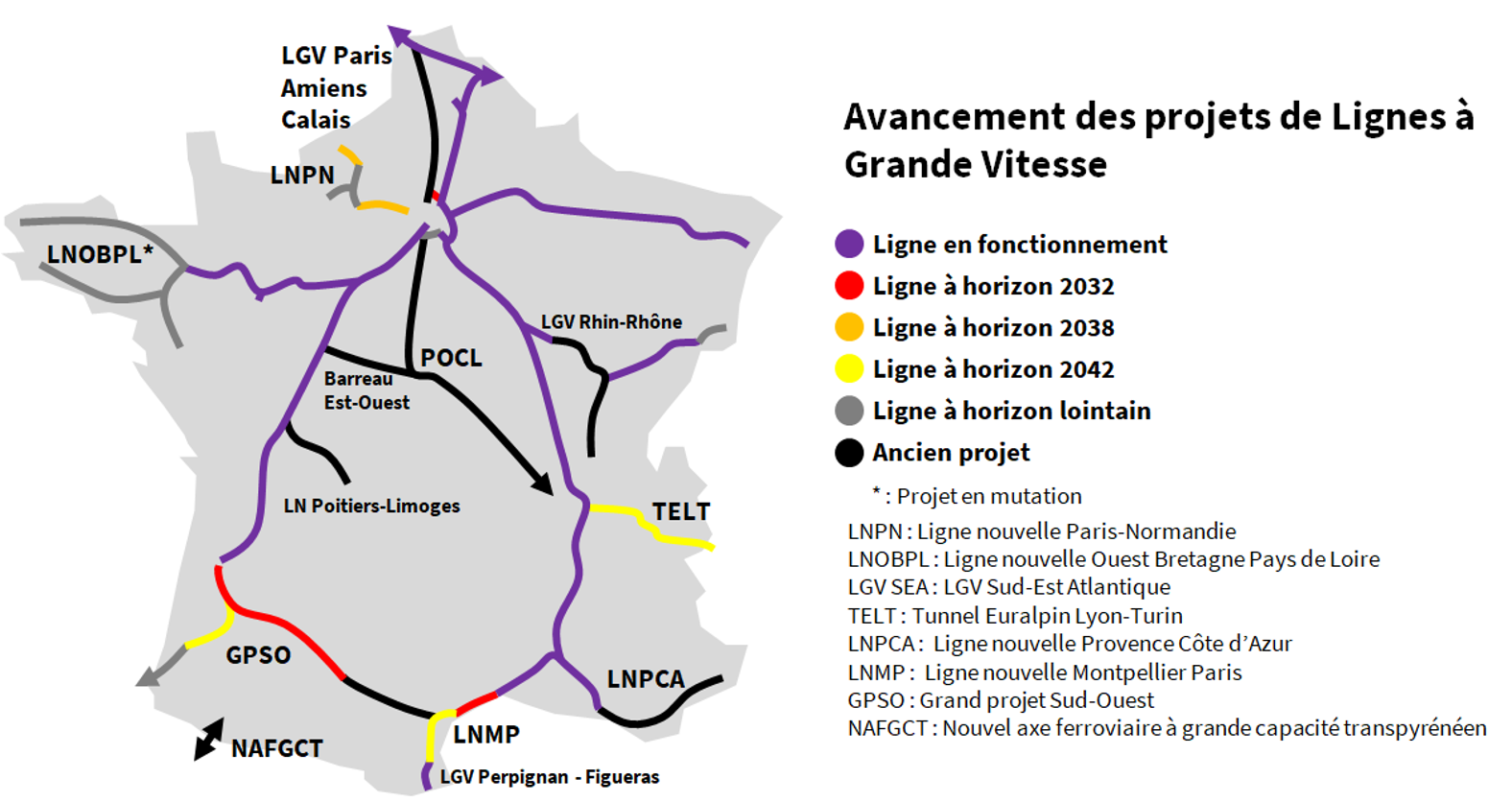 NB : le projet de Ligne Nouvelle Provence Côte d’Azur (LNPCA), dont les phases 1 et 2 ont été estimées à 3,6 milliards d’euros (2020), n’a pas été mentionné ici. En effet, le projet a été largement remanié pour encourager d’abord la desserte locale, et les phases 1 et 2 ne prévoient aucun kilomètre de ligne nouvelle. Celles-ci sont envisagées, éventuellement, dans les phases 3 et 4, repoussées à un horizon incertain.