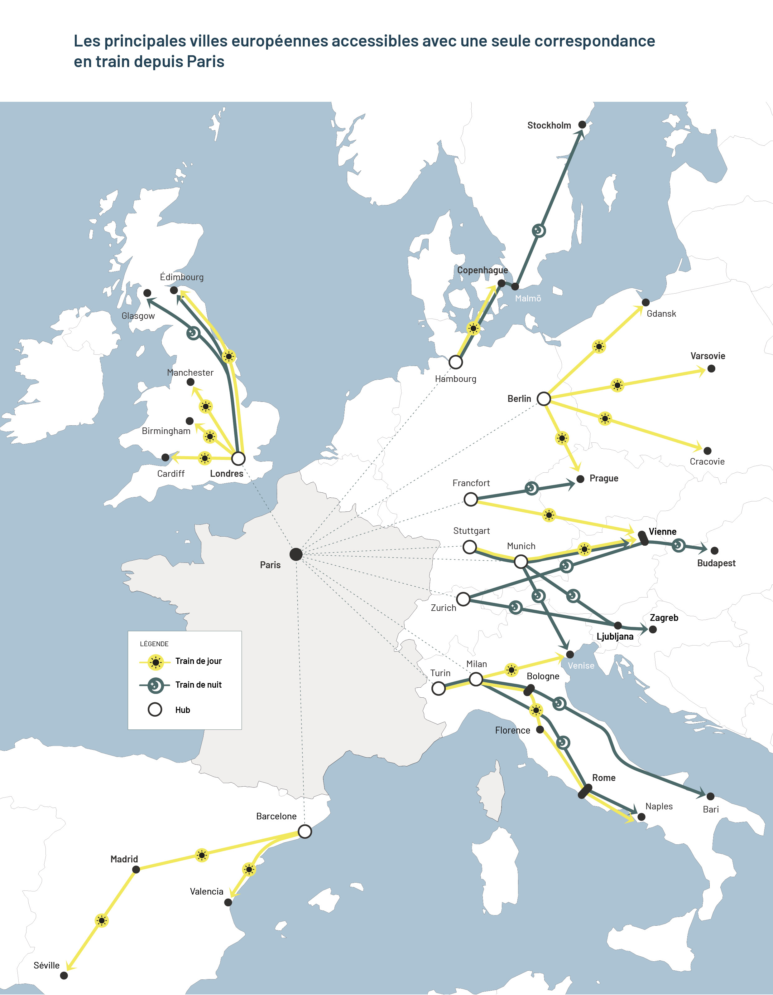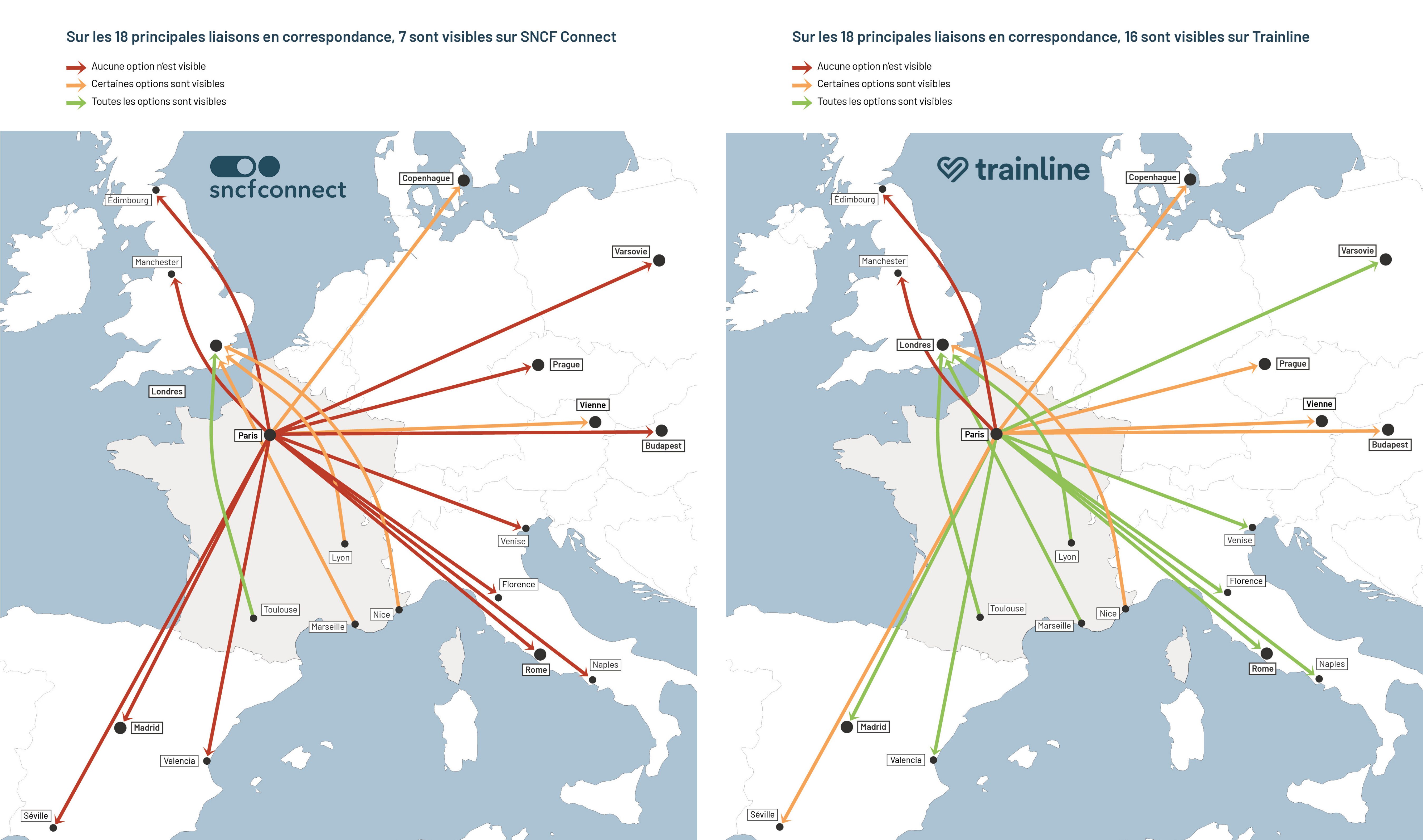 Il existe très peu de trains directs depuis la France vers l’Europe. Sur les 31 liaisons analysées, 4 sont impossibles à réaliser en train dans la journée, 18 nécessitent au moins une correspondance, et seulement 9 disposent d’un train direct. Et même lorsqu’un trajet direct existe en train, l’offre est insuffisante face à la demande : sur Paris-Barcelone par exemple, il n’existe que 2 trains par jour, loin de permettre un report significatif depuis l’avion.