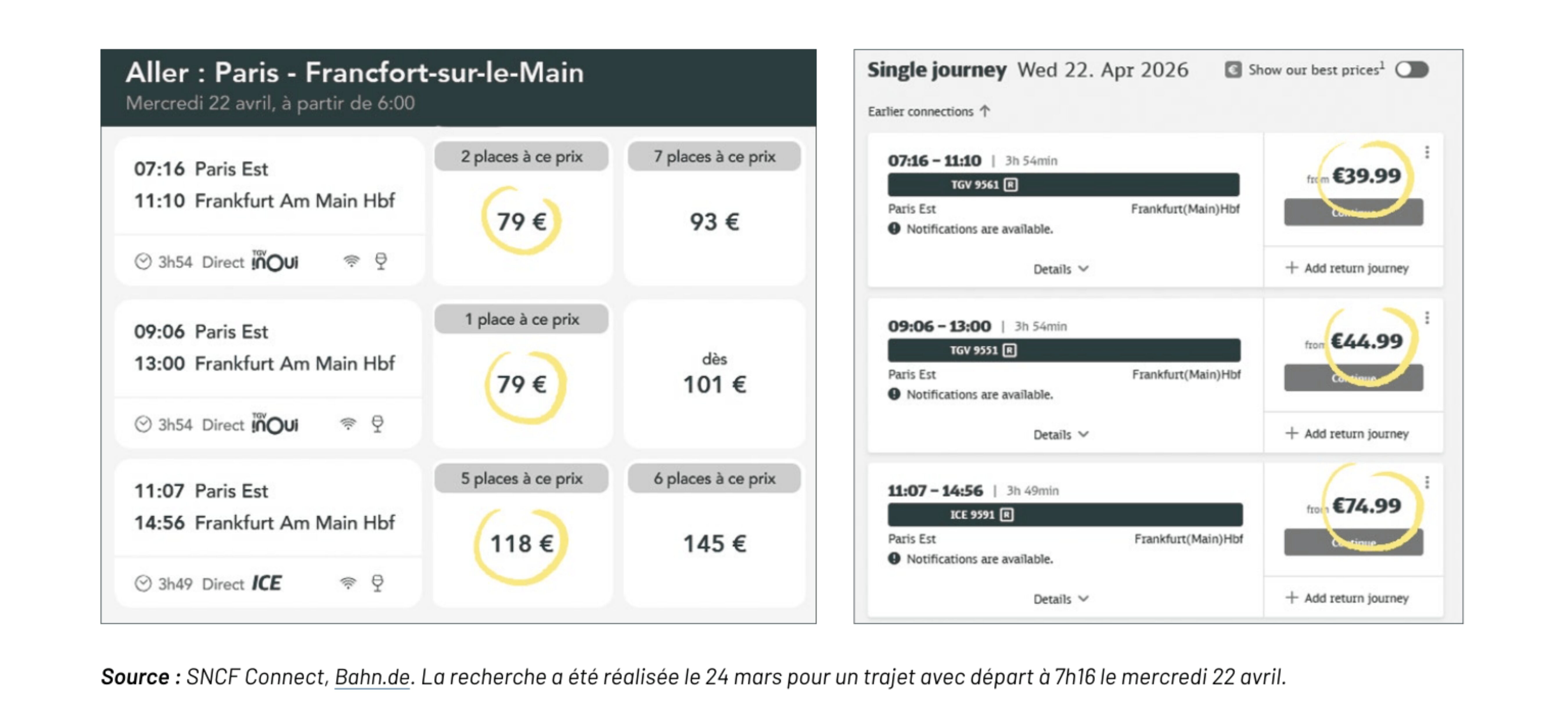 Par ailleurs, SNCF Connect affiche parfois des tarifs bien plus élevés que d’autres plateformes. Un même train Paris-Francfort, opéré par la SNCF et la Deutsche Bahn (DB), pourra être vendu 80 € sur le site de la SNCF, contre 40 € sur celui de la DB ou sur Trainline.